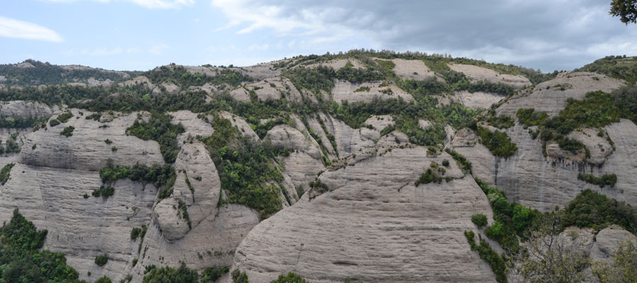 El camí continua per dalt de l’estret engorjat. En prou feines és pot veure l’aigua en alguns punts (i menys jo, que en fan por les alçades), tot i que s’escolta perfectament. M’enfilo una mica, les vistes s’obren cap al torrent Pregon, els boscos i camps ondulats de la zona i, una mica més enllà, els Rasos de Peguera. Seran les vistes que, des de diferents angles, aniré trobant a diferents punts del camí.