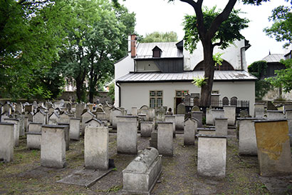 D’aquí anem fins a la propera sinagoga Remuh, la més petita de les set sinagogues que queden a Cracòvia (de les més de vint que hi va arribar a haver, actualment només una activa). Va ser construïda a mitjans del segle XVI i té com a principal atractiu el seu antic i senzill cementiri urbà (que em recorda al que vaig veure a Praga, ara ja fa uns quants anys). Se sap que hi ha més de set-centes làpides, la majoria amb inscripcions en hebreu, tot i que moltes d'elles van ser cobertes de terra després de ser redescobertes durant el segle XX i no es poden veure. Ens crida l’atenció el costum jueu de recordar els morts deixant pedres sobre les seves tombes, d’origen antic i incert. Hi ha varies interpretacions. La primera, és que era una advertència als kohanim (sacerdots jueus), que es tornaven ritualment impurs si s'acostaven a menys de quatre peus d'un cadàver. Per evitar-ho, els jueus van començar a marcar tombes amb piles de roques per indicar-ho. La segona, per mantenir l'ànima en aquest món, ja que el Talmud esmenta que quan una persona mor la seva ànima continua habitant durant un temps a la tomba. D’aquesta manera, posant pedres a la tomba es manté l'ànima en aquest món. La tercera, seria perquè les pedres eviten que els dimonis i golems puguin entrar a les tombes, o que el lloc sigui abandonat i eventualment profanat. La quarta i última (i la que ens agrada més), és que les pedres duren més que les flors. Les flors, encara que agermanen, es panseixen i s’assequen mentre que una pedra no mor, i simbolitza la permanència de la memòria i el llegat.