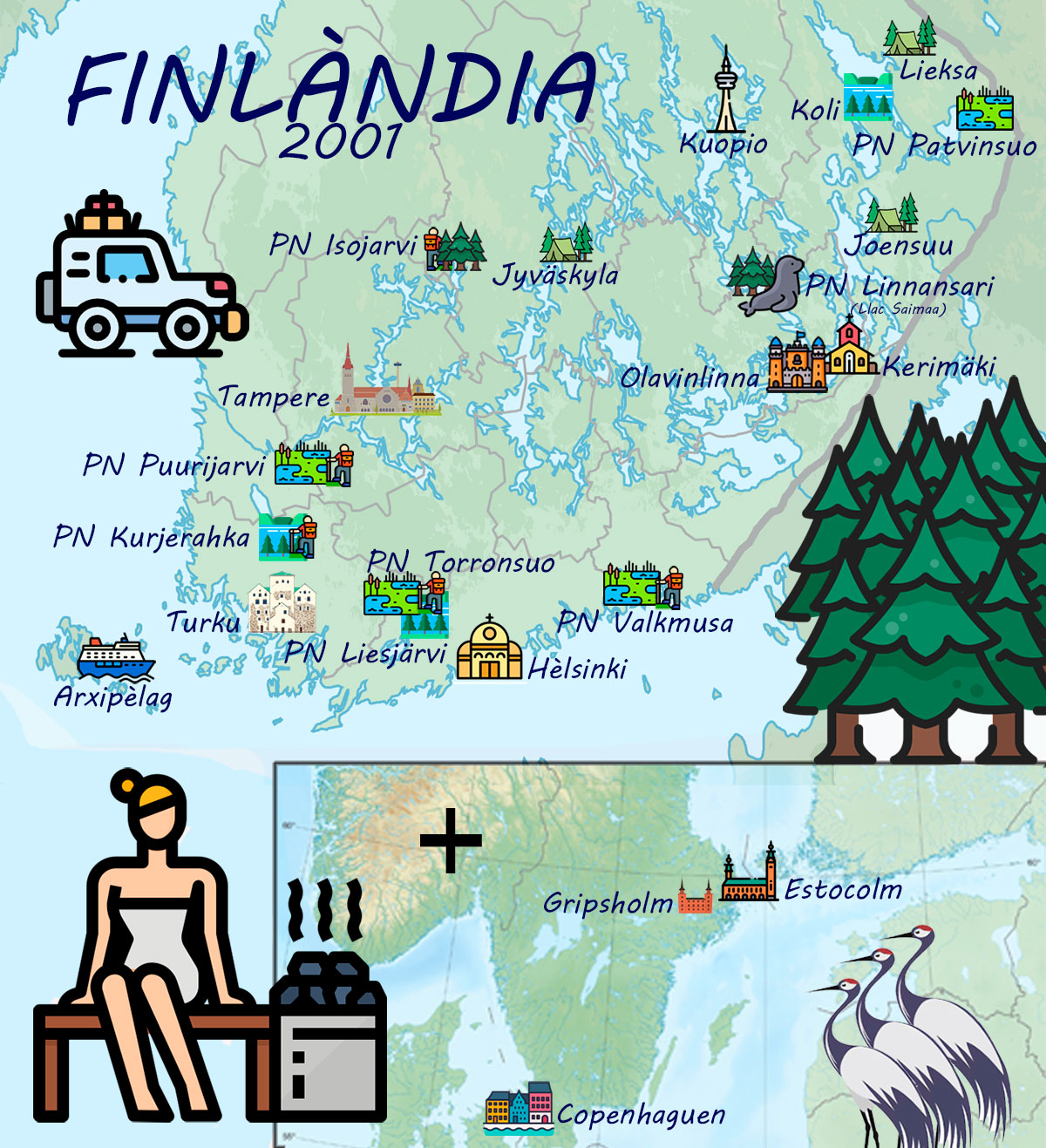 Per què a Finlàndia? per poder veure la taigà i les torberes. Com? com sempre, de la forma més barata possible. De càmping i amb el cotxe des de casa. Quan? del 31 de juliol al 17 d’agost de l’any 2001.