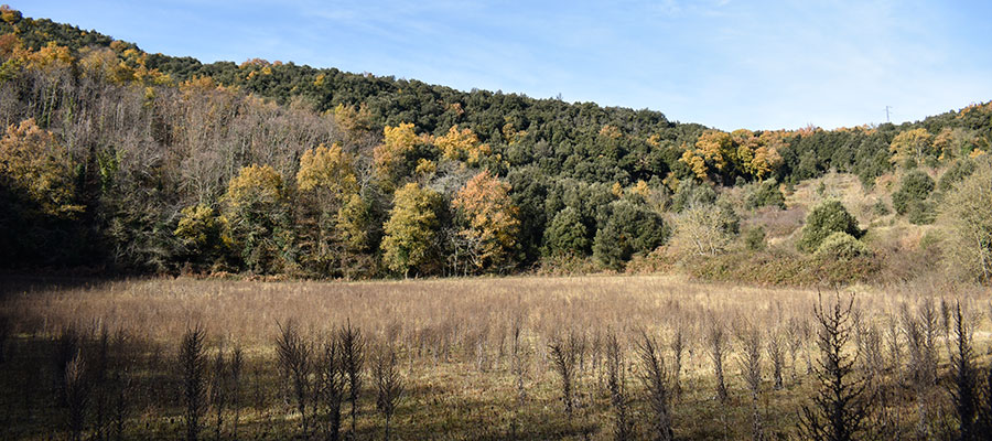 Comencem a caminar a l’ermita de Sant Cosme i de seguida ens comencem a enfilar amb ganes, després el camí ja serà més suau. Primer per alzinars, tot i que durant la ruta els anirem alternant amb alguns prats, camps, freixenedes i rouredes.